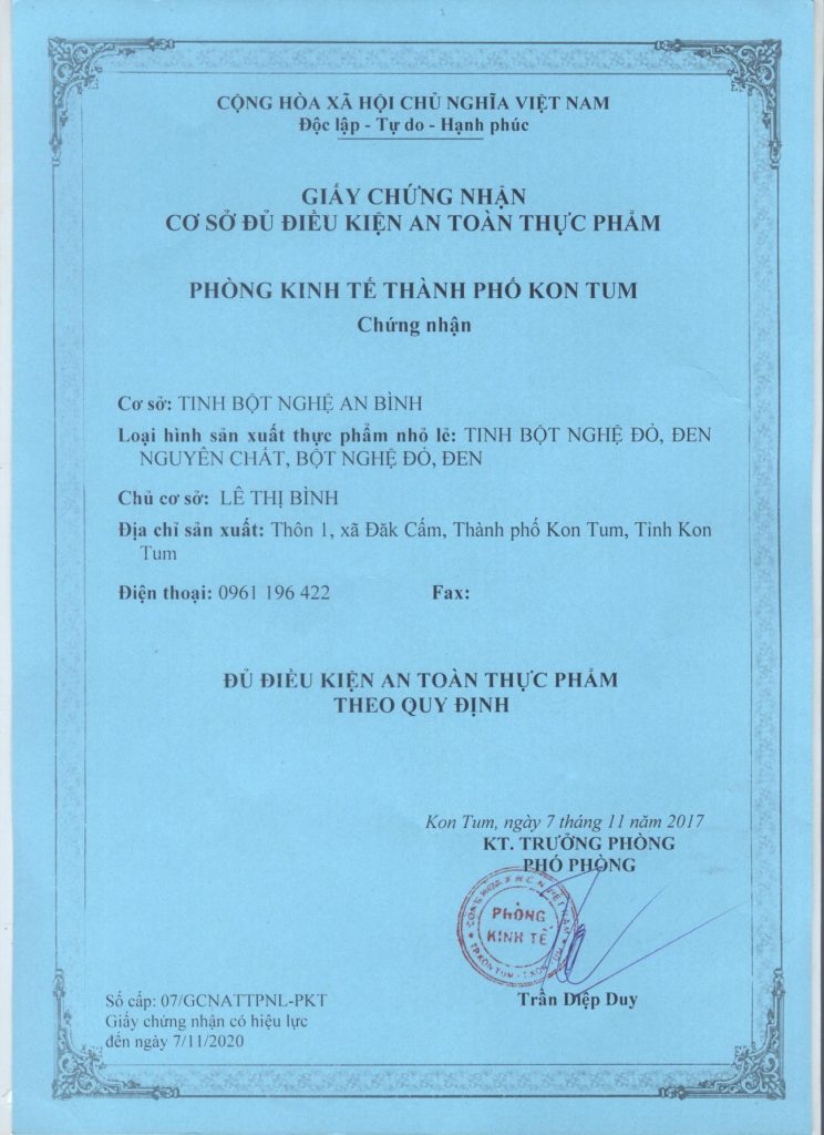 Tinh Bột Nghệ An Bình đã được PHÒNG KINH THẾ TP. KON TUMchứng nhận