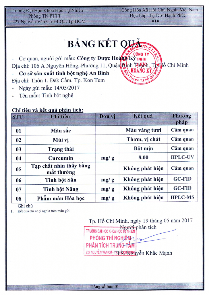 Ngày 19/05/2017, Tinh Bột Nghệ An Bình 1 lần nữa vinh dự được Phòng Thí Nghiệm Đại Học Khoa Học Tự Nhiên TPHCMchứng nhận :