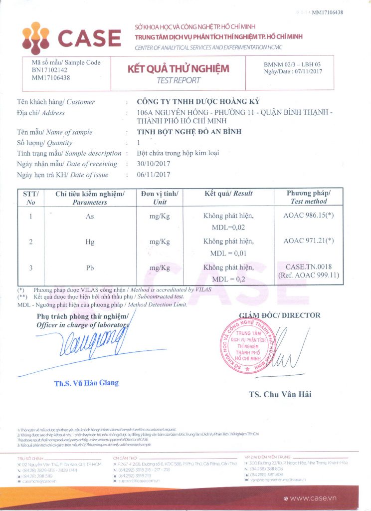 Ngày 07/11/2017 Tinh Bột Nghệ An Bình đã được TRUNG TÂM DỊCH VỤ PHÂN TÍCH THÍ NGHIỆM TP. HỒ CHÍ MINHthuộc SỞ KHOA HỌC VÀ CÔNG NGHỆ TP. HỒ CHÍ MINH kiểm nghiệm và chứng nhận không hề có tạp chất độc hại :