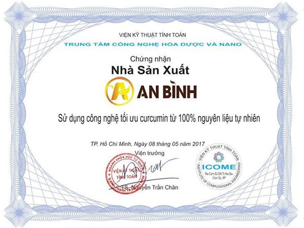 Ngày 08/05/2017, An Bình vinh dự được VIỆN ICOME chứng nhận ““Sử dụng công nghệ tối ưu Curcumin từ 100% nguyên liệu tự nhiên”